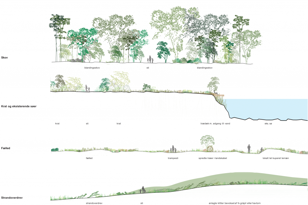 Nordhavn Naturpark skal rumme både fælled, sø, strand, skov og krat, og naturen skal udvikle sig på de betingelser, som de forskellige naturtyper eller biotyper giver.
