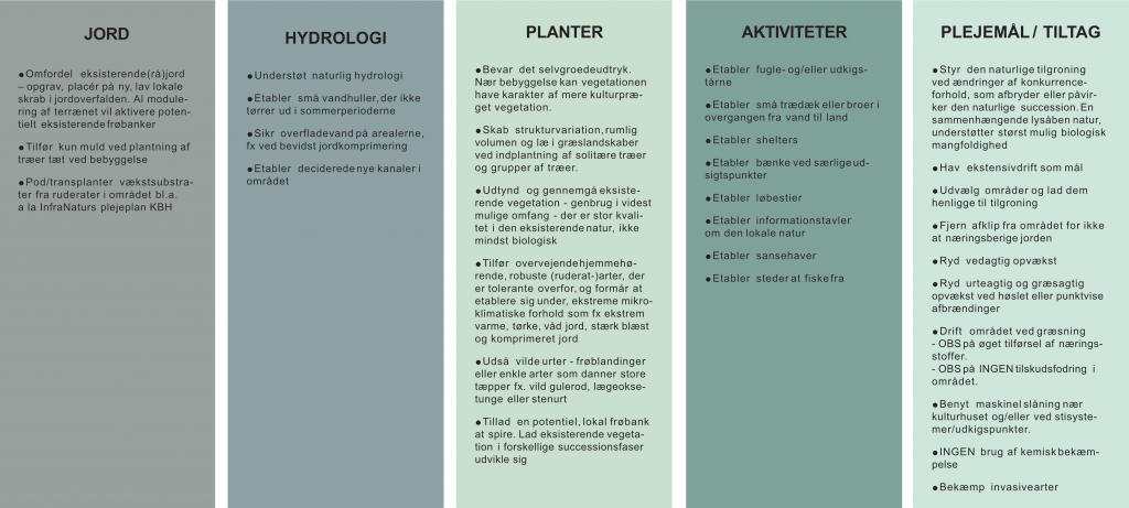 Biotoperne skal understøttes og plejes med naturlige virkemidler. Der skal bruges råjord. Naturlig hydrologi skal understøttes og kan suppleres med vandhuller og jordkomprimering, der holder på vandet. Der laves variationer i biotoperne ved f.eks. forhøjninger og træer, der giver læ og dermed bedre vilkår for nogle planter.