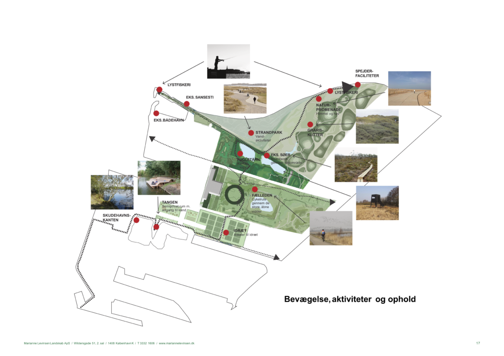 Alle områder vil være tilgængelige. Der vil være plads til leg – f.eks. opsætning af drager. Der vil være stier til motionsløb. Lystfiskerne vil have adgang til Øresund ude på spidsen. Spejderne vil have faciliteter til deres aktiviteter. Fra stranden kan der bades og den giver adgang til vandaktiviteter. Nogle områder vil være til fordybelse – og en af stierne kan f.eks. udformes som en sansesti. De forskellige naturområder giver mulighed for forskellige naturoplevelser.