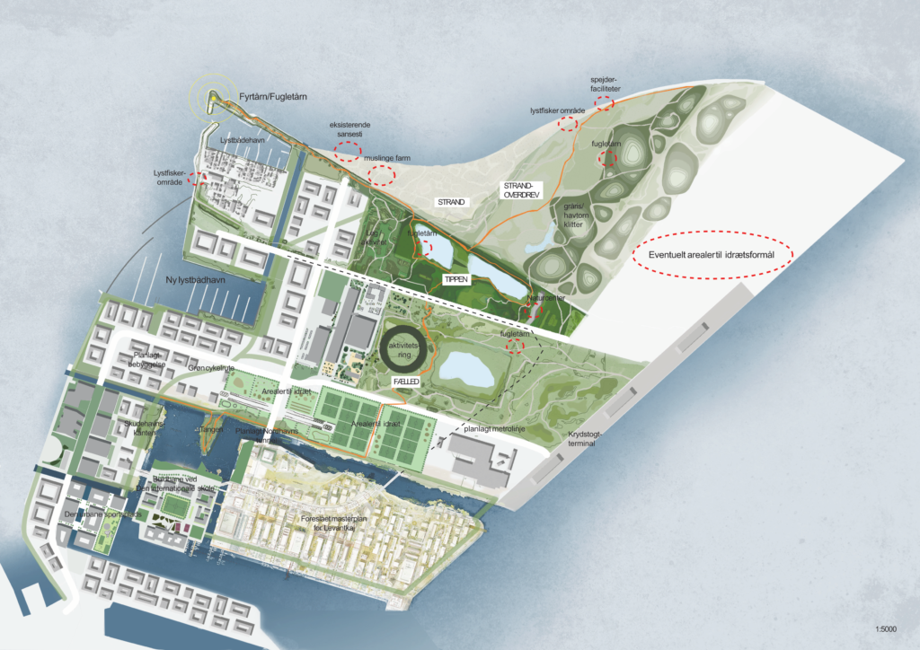 Syd for naturparken kan der ligge et større område på ca 15 ha til idræt af forskelllig art. Med den beliggenhed vil det ligge tæt på det nye Nordhavn og metro.